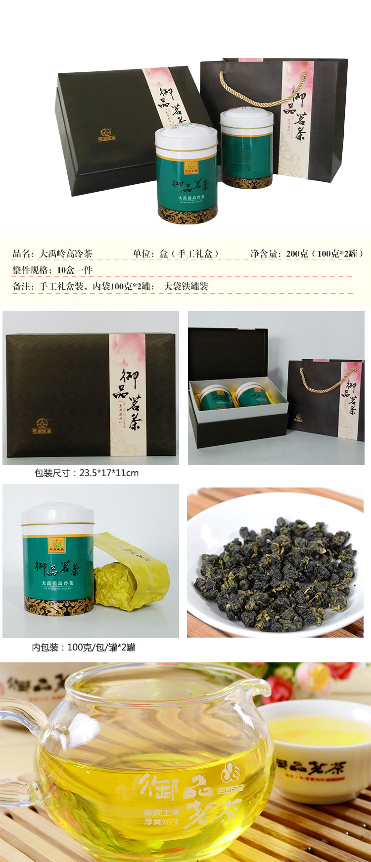 产于台湾花莲、台中、南投三县交会之处,海拔平均2600公尺之梨山大禹岭地区原始森林,此茶区昼夜温差大,土壤有机质含量丰富,山区终年云雾缭绕,是孕育高山茶的优良环境。经雨雾滋养,其茶叶拥有叶片肥厚柔软富果胶质感的特性,香气清雅,余韵浑厚,喉韵无穷更有台湾高山茶王之称